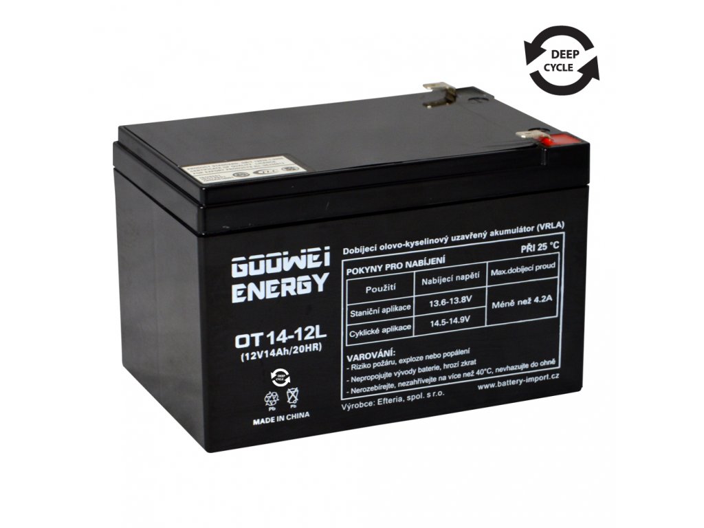 Gelové trakční akumulátory značky GOOWEI ENERGY řada OTL - DEEP CYCLE jsou privátní značkou naší společnosti. Na základě dlouholetých zkušeností v oblasti akumulátorů jsme ve spolupráci s výrobcem kladli důraz na vysokou jakostní kvalitu použitých materiálů (čistotu olova), dlouhou cyklickou životnost (extra silné mřížky článků) a maximální spolehlivost a bezpečnost akumulátorů v provozu. Jedná se o uzavřené olověné akumulátory v provedení VRLA. Technologie hybridní GEL = elektrolyt je ztužen v hybridním gelu (kombinace s AGM), a tím je pevně vázán v útrobách článků baterie, čímž je vyloučen jeho únik. Extra silná mřížka článků zajišťuje vysokou cyklickou odolnost, což tyto akumulátory předurčuje pro aplikace, kde dochází k častému a hlubokému vybíjení / cyklování. Akumulátory GOOWEI ENERGY řada DEEP CYCLE jsou velmi vhodné i pro staniční aplikace, kde slouží jako záložní zdroje v režimu „STAND BY“. Obzvláště vhodné jsou tam, kde dochází k častým výpadkům v dodávkách energie nebo tam, kde se baterie hluboce vybíjejí. Optimální životnost pro režim „STAND BY“ je uváděna 10-12 let, což odpovídá kategorii staničních akumulátorů řady „LONG LIFE“. Díky dlouhodobému kontraktu a přímému dovozu ze zakázkové výroby dokážeme tyto kvalitní akumulátory nabízet za velmi příznivé ceny! Výborný poměr cena / kvalita / výkon řadí akumulátory GOOWEI ENERGY řady OTL - DEEP CYCLE k nejprodávanějším akumulátorům na trhu.