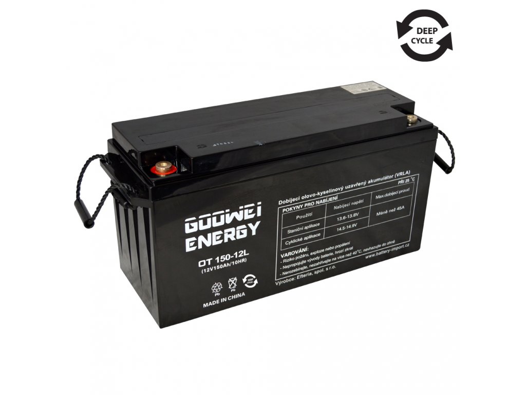 Gelové trakční akumulátory značky GOOWEI ENERGY řada OTL - DEEP CYCLE jsou privátní značkou naší společnosti. Na základě dlouholetých zkušeností v oblasti akumulátorů jsme ve spolupráci s výrobcem kladli důraz na vysokou jakostní kvalitu použitých materiálů (čistotu olova), dlouhou cyklickou životnost (extra silné mřížky článků) a maximální spolehlivost a bezpečnost akumulátorů v provozu. Jedná se o uzavřené olověné akumulátory v provedení VRLA. Technologie hybridní GEL = elektrolyt je ztužen v hybridním gelu (kombinace s AGM), a tím je pevně vázán v útrobách článků baterie, čímž je vyloučen jeho únik. Extra silná mřížka článků zajišťuje vysokou cyklickou odolnost, což tyto akumulátory předurčuje pro aplikace, kde dochází k častému a hlubokému vybíjení / cyklování. Akumulátory GOOWEI ENERGY řada DEEP CYCLE jsou velmi vhodné i pro staniční aplikace, kde slouží jako záložní zdroje v režimu „STAND BY“. Obzvláště vhodné jsou tam, kde dochází k častým výpadkům v dodávkách energie nebo tam, kde se baterie hluboce vybíjejí. Optimální životnost pro režim „STAND BY“ je uváděna 10-12 let, což odpovídá kategorii staničních akumulátorů řady „LONG LIFE“. Díky dlouhodobému kontraktu a přímému dovozu ze zakázkové výroby dokážeme tyto kvalitní akumulátory nabízet za velmi příznivé ceny! Výborný poměr cena / kvalita / výkon řadí akumulátory GOOWEI ENERGY řady OTL - DEEP CYCLE k nejprodávanějším akumulátorům na trhu.