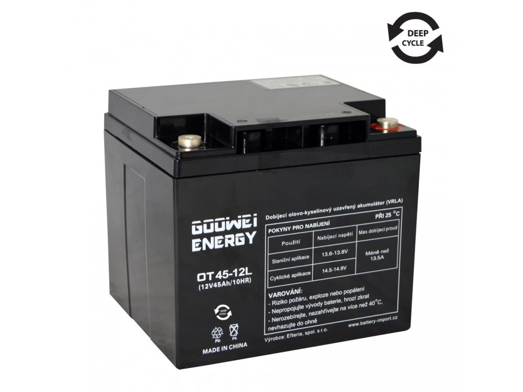 Gelové trakční akumulátory značky GOOWEI ENERGY řada OTL - DEEP CYCLE jsou privátní značkou naší společnosti. Na základě dlouholetých zkušeností v oblasti akumulátorů jsme ve spolupráci s výrobcem kladli důraz na vysokou jakostní kvalitu použitých materiálů (čistotu olova), dlouhou cyklickou životnost (extra silné mřížky článků) a maximální spolehlivost a bezpečnost akumulátorů v provozu. Jedná se o uzavřené olověné akumulátory v provedení VRLA. Technologie hybridní GEL = elektrolyt je ztužen v hybridním gelu (kombinace s AGM), a tím je pevně vázán v útrobách článků baterie, čímž je vyloučen jeho únik. Extra silná mřížka článků zajišťuje vysokou cyklickou odolnost, což tyto akumulátory předurčuje pro aplikace, kde dochází k častému a hlubokému vybíjení / cyklování. Akumulátory GOOWEI ENERGY řada DEEP CYCLE jsou velmi vhodné i pro staniční aplikace, kde slouží jako záložní zdroje v režimu „STAND BY“. Obzvláště vhodné jsou tam, kde dochází k častým výpadkům v dodávkách energie nebo tam, kde se baterie hluboce vybíjejí. Optimální životnost pro režim „STAND BY“ je uváděna 10-12 let, což odpovídá kategorii staničních akumulátorů řady „LONG LIFE“. Díky dlouhodobému kontraktu a přímému dovozu ze zakázkové výroby dokážeme tyto kvalitní akumulátory nabízet za velmi příznivé ceny! Výborný poměr cena / kvalita / výkon řadí akumulátory GOOWEI ENERGY řady OTL - DEEP CYCLE k nejprodávanějším akumulátorům na trhu.