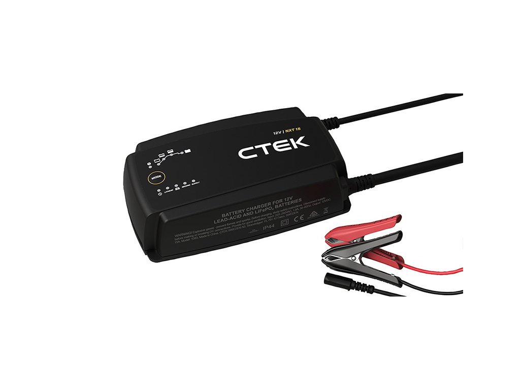Moderní plně automatická nabíječka CTEK NXT15 s nejvyšším nabíjecím proudem až 15A určená pro 12V olověné a lithiové baterie s kapacitou až 350Ah (olověné)/300Ah (lithiové).