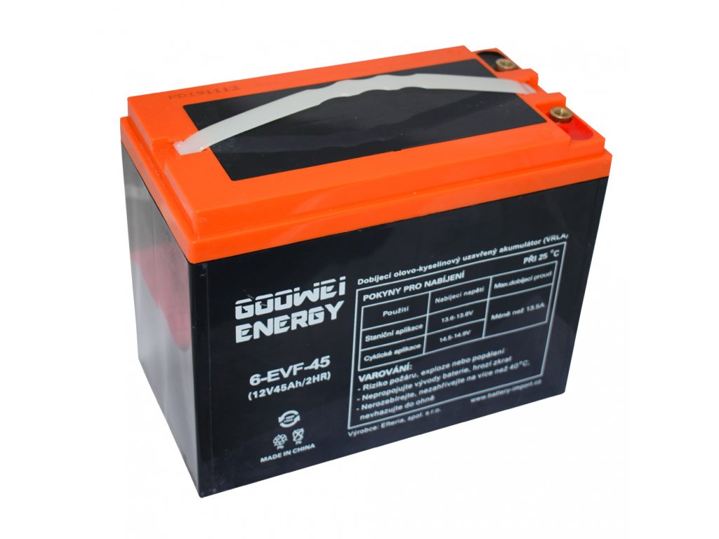 Gelové akumulátory značky GOOWEI ENERGY řada EVF - DEEP CYCLE jsou privátní značkou naší společnosti. Na základě dlouholetých zkušeností v oblasti akumulátorů jsme ve spolupráci s výrobcem kladli důraz na vysokou jakostní kvalitu použitých materiálů (čistotu olova), dlouhou cyklickou životnost (extra silné mřížky článků) a maximální spolehlivost a bezpečnost akumulátorů v provozu. Jedná se o uzavřené olověné akumulátory v provedení VRLA. Technologie hybridní GEL = elektrolyt je ztužen v hybridním gelu (kombinace s AGM), a tím je pevně vázán v útrobách článků baterie, čímž je vyloučen jeho únik. Extra silná mřížka článků zajišťuje velmi vysokou cyklickou odolnost (okolo 600 cyklů při 80% D.O.D = hloubka vybití 80%), což tyto akumulátory předurčuje pro aplikace, kde dochází k častému a hlubokému vybíjení / cyklování, tedy hlavně pro pohony elektromotorů. Díky dlouhodobému kontraktu a přímému dovozu ze zakázkové výroby dokážeme tyto kvalitní akumulátory nabízet za velmi příznivé ceny! Výborný poměr cena / kvalita / výkon řadí akumulátory GOOWEI ENERGY k nejprodávanějším akumulátorům na trhu.